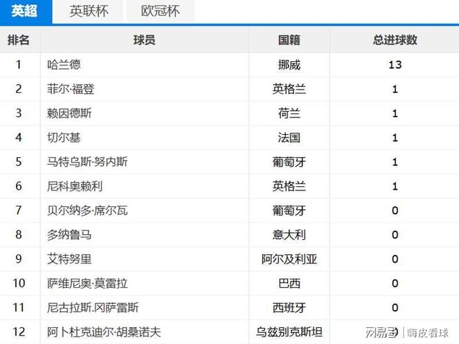 曼城的队内射手榜,哈兰德一共打进13球,随后的5名队友,都只有1个进球,一共只有6人能够进球,哈兰德足足是第二名的13倍,这个数字实在太可怕了!有些球迷可能发现了,曼城不是打进20球吗,还有2球是属于谁的呢?原来,曼城大胜升班马伯恩利的比赛中,对方后卫埃斯特夫,一人贡献两个乌龙球,从某种意义上来看,埃斯特夫才是曼城的二号射手。